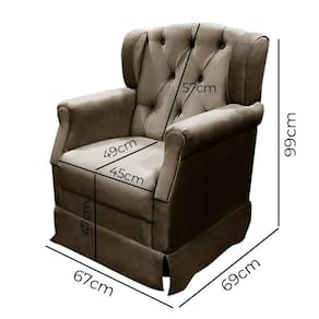 Dimensões da Poltrona: Altura: 99 cm; Largura: 67 cm; Profundidade: 69 cm; Peso: 23,200 Kg; Profundidade do Assento: 49 cm; Largura do Assento: 45 cm; Altura do Encosto: 57 cm; Altura do Assento: 47 cm.