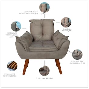 A poltrona decorativa impala proporciona um toque de charme e beleza em seu lar, feita com matéria prima de primeira qualidade, revestida de fibra e percinta no encosto e espuma no assento.Especificações:- estrutura: mdf e eucalipto- tecido: suede- pés: madeiraDimensões externas:Altura : 89 cmLargura: 86 cmComprimento: 86 cmDimensões internas:Altura encosto x assento: 53 cmAltura do chão até o assento: 50 cmProfundidade do assento: 52 cmLargura do assento: 46 cmPés palito envernizados cor melPeso suportado: até 100 kg sem impactoGarantia de fábrica 90 dias para somente defeito de fábrica.AtençãoInstruções de limpeza: utilizar um pano limpo e seco. Não limpar com escovas ou produtos abrasivos,No prazo de garantia não é permitido fazer impermeabilização, pois caso seja feita perde totalmente garantia.Obs: este produto é recomendado para ambientes residenciais em áreas internas, por isso, não o deixe exposto à luz direta do sol, para que não sofra alteração na corMontagem é simples e dever do cliente somente rosquear os pés .Em caso de devolução do produtoAceitaremos a devolução nós seguinte termos.O produto deverá ser embalado da mesma forma que foi entregue, não deverá ter rasgos ou esteja com fissuras.Deverá ser etiquetado de igual modo para que não haja extravio, deverá ter nota de devolução.O produto não poderá estar danificado ou com marcas de usoInformamos que o horário de coleta é horário somente comercial.Fica acordado que finalizar a compra estou totalmente de acordo com toda descrição a qual fui informado através do anuncio a qual afirmo no ato da finalização da compra ter lido.Qualquer duvida estamos a disposição. Marca: Decore.Com