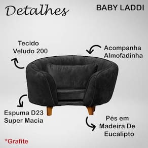 Poltrona Cama Caminha Pet Baby Laddi Veludo, é uma peça de mobiliário especialmente projetada para oferecer conforto e aconchego ao seu pet de estimação. Estrutura produzida em Madeira de Eucalipto e MDF modelado, sendo perfeita tanto como poltrona quanto como cama para o seu pet. Possui um enchimento em espuma D23, que proporciona um suporte macio e confortável para o seu pet descansar, tecido utilizado na poltrona é veludo, resistente e de fácil limpeza, tornando a poltrona pet durável e prática de cuidar. Os 04 pés da poltrona são feitos de madeira de eucalipto com acabamento envernizado em tinta PU com haste para fixação.