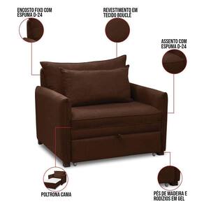 Poltrona Cama Retrátil Solteiro Com Rodízio Cloe Bouclê Marrom E03 - D'rossi A Poltrona Cama Cloe combina design moderno e praticidade, sendo ideal para otimizar seu espaço com conforto. Fabricada em madeira de eucalipto reflorestada, possui assento com percintas elásticas e espuma D-24, garantindo resistência e comodidade. Seu grande diferencial está no assento dobrável e retrátil, que permite uma transformação rápida e prática. Com um simples movimento atravéz do puxador revestido do mesmo tecido, a poltrona se abre completamente, tornando-se uma confortável cama de solteiro. Esse mecanismo facilita o uso no dia a dia, oferecendo comodidade para momentos de descanso ou para acomodar visitas. Além do mais, as almofadas soltas com enchimento de fibra siliconada adiciona um toque extra de aconchego. Seu revestimento em tecido Bouclê Marrom confere sofisticação e aconchego, enquanto os pés de madeira e os rodízios em gel permitem fácil movimentação. Ela suporta até 120 kg de peso, podendo ser utilizada por pessoas de diferentes biotipos. Ela é fácil de transportar, pois tem um peso leve e um tamanho compacto. A Poltrona Cama Cloe é um produto que vai fazer a diferença na sua decoração e no seu bem-estar. Garanta já a sua! Dimensões do Produto: Altura Total: 95 cm Largura Total: 100 cm Profundidade do Assento Fechado: 103 cm Profundidade do Assento Aberto: 190 cm Profundidade do interna do Assento Aberto: 175 cm Peso: 46 kg Especificações do Produto: Estrutura: Madeira Eucalipto Reflorestada Densidade da espuma: Espuma D-24 Revestimento: Tecido Bouclê (Disponível em ) Peso Suportado: Até 120 Kg Tipo de Encosto: Fixo Tipo de Assento: Retrátil com abertura para cama, percintas elásticas Tipo de Pés: Madeira e Rodízios em Gel Diferenciais: Design moderno; Acompanha almofada solta, com enchimento de fibra siliconada Complexidade da Montagem: Baixo Montagem: O produto vai montado Garantia: 90 dias contra de fabricação Instruções de Limpeza: Utilizar um pano limpo e levemente úmido Quantidade de Volumes 1 Caixa Medida das Embalagens Caixa: 98 cm x 103 cm x 106 cm : É feita somente até o térreo ou portaria. Não levamos em andares superiores. Confira sempre as medidas das embalagens.