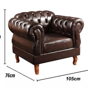 Não rasgue a embalagem antes de ter certeza que ficará com tudo. Acompanha Almofadas extras: Não Acompanha Puff: Não Almofada do assento: Removível Almofada do encosto: Não Possui Altura do assento até o chão: 0 cm Altura do Encosto: 82 cm Ambiente Principal: Sala de Estar Complexidade da Montagem: Baixa: pode ser montado por uma pessoa sozinha Cor: Café Cor do Produto: Café Design Assinado: Não Enchimento do Braço: Espuma D-26 Encosto para a Cabeça: Não Estampado: Não Extensível: Não Informações Complementares: 120Kg por acento Itens Inclusos: 1 Poltrona Duquesa (incluindo seus respectivos pés apenas pra enroscar) Linha ou Coleção: Chesterfield Material do Braço: Madeira Eucalipto Material dos Pés: Madeira Eucalípto Modelo de Poltrona: Fixo Necessita Montagem: Sim Origem do Produto: Nacional Peso: 35 kg Possui Percintas Elásticas: Sim Possui Pés: 04 Possui Rodízio: Não Recomendações de Uso, Manutenção e Limpeza: Limpeza e cuidados: pode ser utilizado aspirador de pó, escova com cerdas macias ou limpeza a seco. Não utilizar produtos químicos, abrasivos ou limpeza a vapor. Evitar exposição prolongada ao sol. Sistema de Montagem: Enroscar os Pés Suporta Até (kg): 120 kg Tecido Predominante: Couro Sintético Tipo de Assento: Fixo Tipo de Encosto: Fixo Tipo de Poltrona: Decorativa