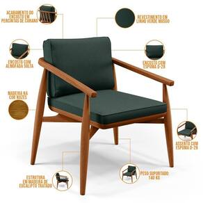 Com sua resistente estrutura em madeira, na cor nozes, o encosto com percintas em corano com almofada solta e o assento revestido em linho, deixarão sua decoração ainda mais sofisticada. Oferecendo máximo conforto sem deixar de transmitir todo a magnitude que seu lar merece.