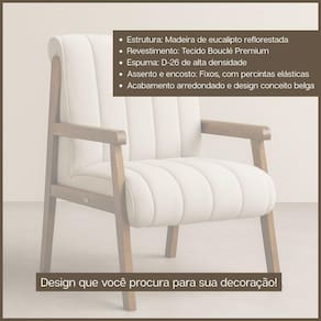 Estrutura em madeira de eucalipto reflorestada, base em madeira maciça, tecido bouclé premium.A Poltrona Conceito Belga Bouclé Premium alia elegância, conforto e durabilidade em um só produto. Com estrutura em madeira de eucalipto reflorestada e base maciça, é resistente e estável, ideal para uso diário em salas de estar, quartos ou recepções.