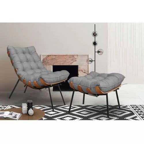 - Itens inclusos: 1 Cadeira Costela e 1 Puff Costela; Ambiente Principal: Sala de Estar Cor: Cinza Cor do Produto: Cinza Escala de Brilho: Fosco Itens Inclusos: 01 Poltrona + 01 Puff Marca: TNA Decor Material da Estrutura: Metal Necessita Montagem: Não Peso: 80 kg Possui Baú: Não Possui Pés: Não Recomendações de Uso, Manutenção e Limpeza: Pano seco Suporta Até (kg): 120 kg