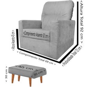 Medidas Da Poltrona Altura - Total = 92 cm Altura Assento= 45 cm Profundidade Total = 72 cm Comprimento Total = 68 cm Comprimento Assento = 52 cm