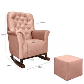A Poltrona Agatha Canoa com Puff Reto Rose combina elegancia e conforto com estrutura em pinus e eucalipto de reflorestamento e revestimento em veludo. Inclui puff reto e assento em espuma D20 e D23, com acabamento em botone. Ideal para ambientes internos, suporta ate 120 kg por pessoa e possui percintas elasticas para suporte adicional.