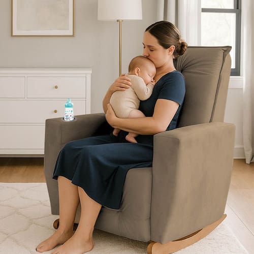 Feita com matéria-prima de alta qualidade a poltrona possui estofado revestido por tecido de toque suave que proporciona aconchego para os momentos de amamentação.
