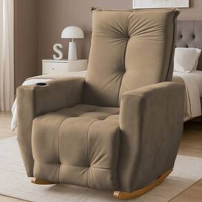 A poltrona possui um balanço suave em sua base, e um encosto alto com espuma de excelente densidade e estrutura sólida de madeira.