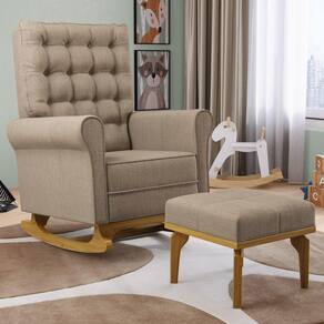 Uma Poltrona de Balanço feita com materiais de alta qualidade, estrutura em madeira de eucalipto, o tecido linho macio e resistente, e a espuma D23 a densidade ideal para o seu conforto, base em madeira com um lindo design e balanço suave, que ajuda a relaxar e a embalar o sono do seu bebê. O Kit Poltrona e Puff possui um design moderno e sofisticado, com detalhes em botonê revestido no encosto, que dão um toque de charme e elegância ao ambiente. A Poltrona de Amamentação também acompanha um puff pés madeira tecido linho, que serve como apoio para os pés ou como assento extra. O puff tem o mesmo acabamento da poltrona, criando um conjunto harmonioso e bonito.