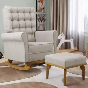 Uma Poltrona de Balanço feita com materiais de alta qualidade, estrutura em madeira de eucalipto, o tecido linho macio e resistente, e a espuma D23 a densidade ideal para o seu conforto, base em madeira com um lindo design e balanço suave, que ajuda a relaxar e a embalar o sono do seu bebê. O Kit Poltrona e Puff possui um design moderno e sofisticado, com detalhes em botonê revestido no encosto, que dão um toque de charme e elegância ao ambiente. A Poltrona de Amamentação também acompanha um puff pés madeira tecido linho, que serve como apoio para os pés ou como assento extra. O puff tem o mesmo acabamento da poltrona, criando um conjunto harmonioso e bonito.