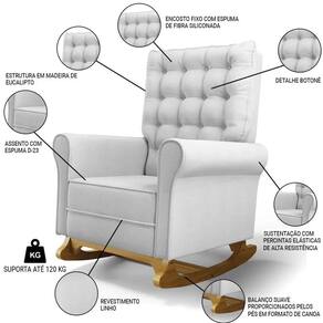 Uma Poltrona de Balanço feita com materiais de alta qualidade, estrutura em madeira de eucalipto, o tecido linho macio e resistente, e a espuma D23 a densidade ideal para o seu conforto, base em madeira com um lindo design e balanço suave, que ajuda a relaxar e a embalar o sono do seu bebê. O Kit Poltrona e Puff possui um design moderno e sofisticado, com detalhes em botonê revestido no encosto, que dão um toque de charme e elegância ao ambiente. A Poltrona de Amamentação também acompanha um puff pés madeira tecido linho, que serve como apoio para os pés ou como assento extra. O puff tem o mesmo acabamento da poltrona, criando um conjunto harmonioso e bonito.
