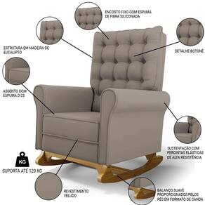 Uma Poltrona de Balanço feita com materiais de alta qualidade, estrutura em madeira de eucalipto, o tecido Veludo macio e resistente, e a espuma D23 a densidade ideal para o seu conforto, base em madeira com um lindo design e balanço suave, que ajuda a relaxar e a embalar o sono do seu bebê. O Kit Poltrona e Puff possui um design moderno e sofisticado, com detalhes em botonê revestido no encosto, que dão um toque de charme e elegância ao ambiente. A Poltrona de Amamentação também acompanha um puff pés madeira tecido Veludo, que serve como apoio para os pés ou como assento extra. O puff tem o mesmo acabamento da poltrona, criando um conjunto harmonioso e bonito.