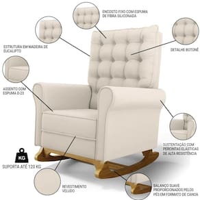 Uma Poltrona de Balanço feita com materiais de alta qualidade, estrutura em madeira de eucalipto, o tecido Veludo macio e resistente, e a espuma D23 a densidade ideal para o seu conforto, base em madeira com um lindo design e balanço suave, que ajuda a relaxar e a embalar o sono do seu bebê. O Kit Poltrona e Puff possui um design moderno e sofisticado, com detalhes em botonê revestido no encosto, que dão um toque de charme e elegância ao ambiente. A Poltrona de Amamentação também acompanha um puff pés madeira tecido Veludo, que serve como apoio para os pés ou como assento extra. O puff tem o mesmo acabamento da poltrona, criando um conjunto harmonioso e bonito.