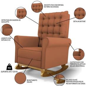 Uma Poltrona de Balanço feita com materiais de alta qualidade, estrutura em madeira de eucalipto, o tecido Veludo macio e resistente, e a espuma D23 a densidade ideal para o seu conforto, base em madeira com um lindo design e balanço suave, que ajuda a relaxar e a embalar o sono do seu bebê. O Kit Poltrona e Puff possui um design moderno e sofisticado, com detalhes em botonê revestido no encosto, que dão um toque de charme e elegância ao ambiente. A Poltrona de Amamentação também acompanha um puff pés madeira tecido Veludo, que serve como apoio para os pés ou como assento extra. O puff tem o mesmo acabamento da poltrona, criando um conjunto harmonioso e bonito.