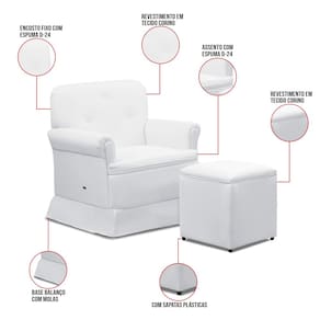 A poltrona possui um sistema de balanço com molas que proporciona um movimento suave e contínuo, ideal para relaxar em momentos de tranquilidade e conexão. Acompanha um puff revestido no mesmo tecido da poltrona, que permite apoiar os pés de forma confortável, favorecendo uma postura relaxada.