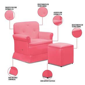 A Poltrona com Puff Lígia é uma excelente escolha para quem busca conforto, elegância e funcionalidade em um único produto. Ideal para compor espaços voltados ao cuidado infantil, como quartos de bebê ou áreas de descanso, ela combina um design moderno com materiais de alta qualidade. Sua estrutura é fabricada em madeira de eucalipto reflorestada, oferecendo resistência e durabilidade. O revestimento em tecido sintético Pink proporciona um toque sofisticado e combina facilmente com diversos estilos de decoração. O enchimento em espuma D-24 garante conforto e suporte adequados para longos períodos de uso, enquanto as percintas elásticas no assento e o detalhe em botonê no encosto contribuem para uma experiência de descanso ainda mais agradável. A poltrona possui um sistema de balanço com molas que proporciona um movimento suave e contínuo, ideal para relaxar em momentos de tranquilidade e conexão. Acompanha um puff revestido no mesmo tecido da poltrona, que permite apoiar os pés de forma confortável, favorecendo uma postura relaxada. Além do conforto, o produto se destaca pela praticidade: possui montagem simples, baixo nível de complexidade e já vem montado, pronto para uso.