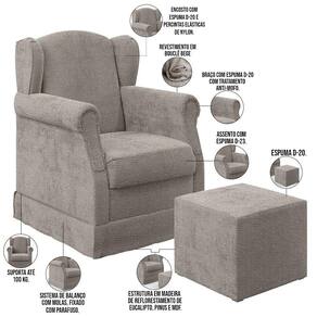 Características: Estrutura em madeira de reflorestamento de eucalipto, pinus e MDF. Revestimento em Bouclê na cor Bege de alta qualidade. Assento com espuma D-23. Encosto com espuma D-20. Braço com espuma D-20 com tratamento anti-mofo. Percinta elástica de Nylon. Peso suportado: Até 100 kg. Sistema de balanço em madeira com molas, fixado com parafusos.
