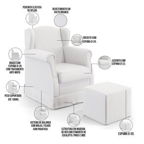 Características: Estrutura em madeira de reflorestamento de eucalipto, pinus e MDF; Revestimento em Facto na cor Branco de alta qualidade; Assento com espuma D-23; Encosto com espuma D-20; Braço com espuma D-20 com tratamento anti-mofo; Percinta elástica de Nylon; Peso suportado: Até 100 kg; Sistema de balanço em madeira com molas, fixado com parafusos;