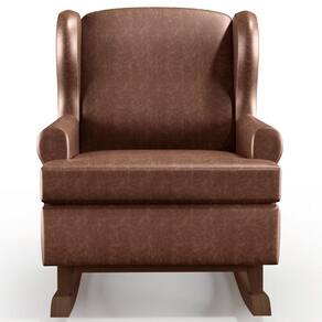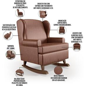 Características: Estrutura em madeira de pinus e eucalipto de reflorestamento, com imunização contra mofo, cupim e microrganismos. Revestimento em Couríssimo na cor Marrom de alta qualidade. Encosto fixo com percintas elásticas, espuma D-23 e tratamento antimofo. Assento com espuma D-20, tratamento antimofo e almofada solta. Sustentação com percintas elásticas de alta resistência. Base com pés em formato de canoa e balanço suave. Peso suportado: Até 100 kg.