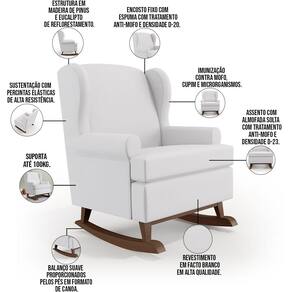 Características: Estrutura em madeira de pinus e eucalipto de reflorestamento, com imunização contra mofo, cupim e microrganismos. Revestimento em Facto Branco Fosco de alta qualidade. Encosto fixo com percintas elásticas, espuma D-23 e tratamento antimofo. Assento com espuma D-20, tratamento antimofo e almofada solta. Sustentação com percintas elásticas de alta resistência. Base com pés em formato de canoa e balanço suave. Peso suportado: Até 100 kg.
