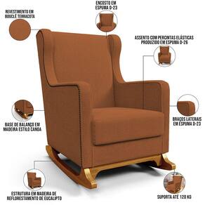 Características: Estrutura em madeira de reflorestamento de eucalipto. Revestimento em Bouclê de alta qualidade. Assento com espuma D-26 e percintas elásticas. Encosto e braços com espuma D-23. Peso suportado: Até 120 kg. Base de balanço em madeira estilo canoa.