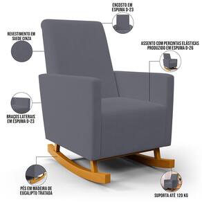 Características: Estrutura em madeira de reflorestamento de eucalipto. Revestimento em Suede na cor Cinza de alta qualidade. Assento com espuma D-26 e percintas elásticas. Encosto e braços com espuma D-23. Peso suportado: Até 120 kg. Base de balanço em madeira estilo canoa.