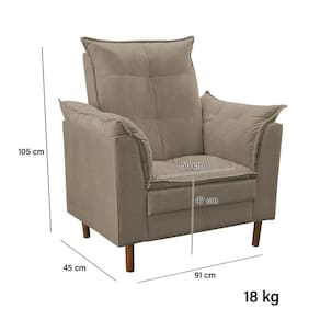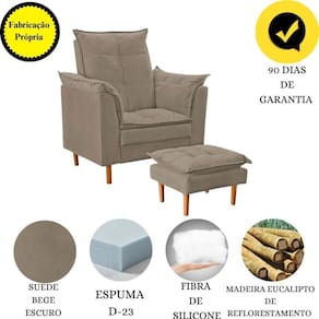 A Poltrona Confortável Liz possui estrutura em madeira de eucalipto e é revestida em suede, garantindo uma maciez inigualável ao toque. O puff, um componente essencial, oferece conforto adicional para os pés, tornando cada momento ainda mais agradável.