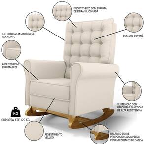 Uma Poltrona de Balanço é feita com materiais de alta qualidade, estrutura em madeira de eucalipto, o tecido Veludo macio e resistente, percintas elásticas no assento e encosto, e a espuma D23 a densidade ideal para o seu conforto, base em madeira com um lindo design e balanço suave, que ajuda a relaxar e a embalar o sono do seu bebê. A Poltrona de Amamentação, possui um design moderno e sofisticado, com detalhes em botonê revestido no encosto, que dão um toque de charme e elegância ao ambiente.