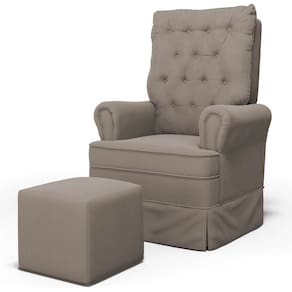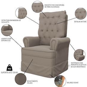 Uma Poltrona de Balanço feita com materiais de alta qualidade, estrutura em madeira de eucalipto, o tecido Veludo macio e resistente, e a espuma D23 a densidade ideal para o seu conforto, com um lindo design e balanço suave, que ajuda a relaxar e a embalar o sono do seu bebê. O Kit Poltrona e Puff possui um design moderno e sofisticado, com detalhes em botonê revestido no encosto, que dão um toque de charme e elegância ao ambiente. A Poltrona de Amamentação também acompanha um puff, que serve como apoio para os pés ou como assento extra. O puff tem o mesmo acabamento da poltrona, criando um conjunto harmonioso e bonito.