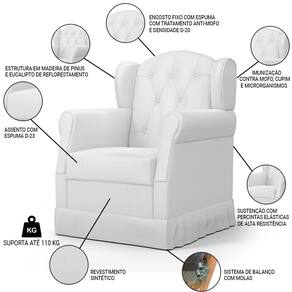 A Poltrona de Amamentação e Descanso com Balanço e Puff Lucy P04 Sintético Branco - Mpozenato é ideal para as mamães que buscam conforto e praticidade na hora de cuidar do seu bebê. Ela é feita de Tecido Sintético, que é fácil de limpar e combina com qualquer ambiente. A estrutura é de madeira Eucalipto e Pinus de Reflorestamento imunizada contra mofo, cupim e microrganismos, garantindo durabilidade e segurança. O balanço proporciona um movimento suave e relaxante, enquanto o puff serve como apoio para os pés. A poltrona tem um design moderno e elegante, que vai deixar o seu quarto ou sala mais bonito e aconchegante. Disponível nas versões com Base Balanço e com Base Fixa, verifique as especificações do produto e adquira já a sua!