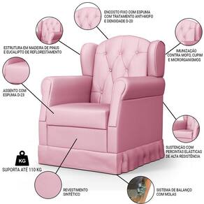 A Poltrona de Amamentação e Descanso com Balanço e Puff Lucy P04 Sintético Rosa - Mpozenato é ideal para as mamães que buscam conforto e praticidade na hora de cuidar do seu bebê. Ela é feita de Tecido Sintético, que é fácil de limpar e combina com qualquer ambiente. A estrutura é de madeira Eucalipto e Pinus de Reflorestamento imunizada contra mofo, cupim e microrganismos, garantindo durabilidade e segurança. O balanço proporciona um movimento suave e relaxante, enquanto o puff serve como apoio para os pés. A poltrona tem um design moderno e elegante, que vai deixar o seu quarto ou sala mais bonito e aconchegante. Disponível nas versões com Base Balanço e com Base Fixa, verifique as especificações do produto e adquira já a sua!