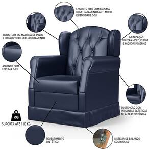 A Poltrona de Amamentação e Descanso com Balanço Lucy P04 Sintético Azul Marinho - Mpozenato é um móvel que alia conforto e design. Fabricada em madeira de Eucalipto de Reflorestamento, ela possui uma estrutura resistente e durável. Sua espuma D-20 e D-23 proporciona um conforto extra para os momentos de descanso e amamentação. O Balanço é um diferencial que ajuda a relaxar e acalmar tanto a mãe quanto o bebê. Além disso, o revestimento Sintético é fácil de limpar e manter, tornando a poltrona ainda mais prática e funcional. Com a Poltrona Lucy, a mamãe terá um cantinho especial para cuidar do seu bebê com todo o conforto e estilo que deseja. Compre já!