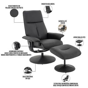 Características: Estrutura em madeira compensada, base em aço com revestimento em PU. Revestimento em PU de alta qualidade na tonalidade Preto. Encosto reclinável e assento giratório. Possui 6 pontos de massagem com modos independentes e função aquecimento. Produto bivolt com controle. Acompanha apoio para pés. Tempo de funcionamento recomendado é de 30 minutos. Suporta até 120 kg.