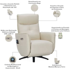 Criada para quem exige sofisticação e bem-estar, seu design contemporâneo integra-se perfeitamente a ambientes modernos, enquanto sua tecnologia avançada conquista até os mais refinados apreciadores do conforto. Com 6 pontos de massagem que envolvem seu corpo e aquecimento no encosto, cada momento será uma jornada de relaxamento profundo. Além disso, é uma poltrona giratória manual, pensada para se aproveitar diferentes ângulos do ambiente. Já o ajuste da reclinação elétrica é feito com controle remoto, ao passo que até seus dispositivos pessoais terão espaço graças ao conector USB integrado. Para completar, o bolso lateral oferece praticidade para manter tudo ao alcance das mãos, enquanto você desfruta da experiência.