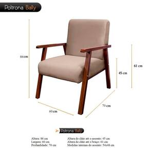 Dimensões e peso: - Comprimento: 60 cm - Profundidade: 70 cm - Altura: 86 cm - Interior do assento: 54 x 48 cm - Altura dos pés até o assento: 45 cm - Altura dos pés até o braço: 61 cm - Peso do produto: 9,800 kg.