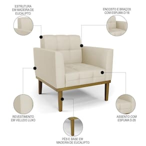 Esta Poltrona Decorativa é revestida em Veludo Luxo, que é durável e fácil de limpar, e ainda valoriza o design da poltrona. Os braços e encosto são confortáveis em espuma D-18, já o assento é com espuma D-26 de alta densidade, que garante um assento firme e aconchegante, ideal para relaxar após um dia cansativo. A base em madeira de eucalipto é um charme à parte, que confere um toque Rústico e sofisticado à peça. A poltrona tem uma estrutura resistente e suporta até 120 kg. A montagem é muito simples, pois a Poltrona já vem pronta, bastando apenas fixar a base com os parafusos que acompanham o produto. A limpeza também é muito prática, pois basta utilizar um pano limpo e levemente úmido, sem produtos abrasivos, para manter a sua poltrona sempre em bom estado. Sem dúvidas um item que vai transformar a sua sala em um ambiente mais confortável e estiloso!