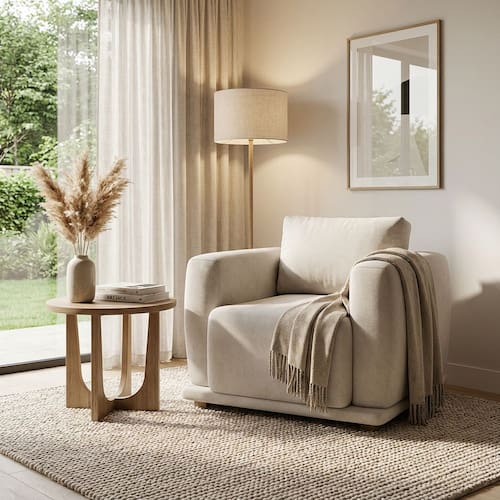 Tecido Bouclé Premium, Espuma D26, Fibra siliconada importada, Flocos de espuma, Madeira maciça, MadeiraVendido e entregue por CLIQUE & DECORE