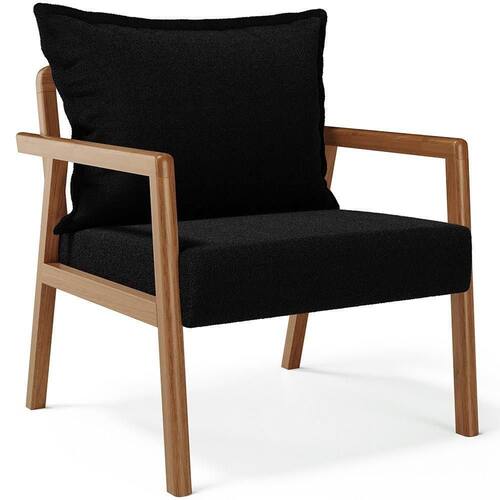A Poltrona Decorativa Para Sala de Estar e Living Alícia B04 Bouclê Preto é a peça perfeita para adicionar um toque de estilo moderno a sua sala de estar. Com sua estrutura em madeira maciça envernizada, essa poltrona de madeira traz durabilidade e elegância para o ambiente. O assento estofado e revestido com materiais de qualidade oferece conforto excepcional, permitindo que você relaxe com estilo. Já o design moderno combina perfeitamente com qualquer tipo de decoração, tornando-a uma escolha versátil para qualquer sala de estar, living, recepção, escritório e diversos outros ambientes. A cereja do bolo fica por conta do detalhe da corda trançada no encosto com a almofada sobreposta, um charme à parte.