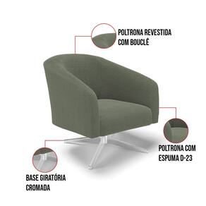 Tem novidades chegando por aqui! Olha só essa nossa inédita Poltrona Stella Bouclê. A Poltrona Stella Bouclê é para todas as ocasiões, é ideal para você relaxar, assistir tv ou ler um livro, mantendo-o confortável ao longo do dia! Um estofado versátil, que foge do convencional pelo seu design e tecido luxuoso. Seu formato curvo, marcante e sofisticado, oferece conforto de forma excepcional, com aquela sensação de abraço, que deixa o coração quentinho! Ela é fácil de transportar, pois tem um peso leve e um tamanho compacto. Ela suporta até 120 kg de peso, podendo ser utilizada por pessoas de diferentes biotipos. Desenvolvida com atenção aos detalhes para atender todas suas expectativas e necessidades, seu aspecto arredondado e anatômico possibilita que a postura fique sempre alinhada mantendo a coluna na posição correta. Ela dispõe de um acabamento impecável revestida em Bouclê em tom Menta, um tecido um tecido maleável que além de ser muito bonito é a grande tendência do momento, uma lã mais refinada e quente com toque suave semelhante à textura natural da ovelha. Contém uma estrutura em madeira de reflorestamento eucalipto, sua sustentação é dada pela Base Giratória Cromada, que garante mais segurança e firmeza ao sentar-se. Ela tem um acabamento reforçado e espuma de qualidade D23, que oferece maciez e aconchego. Além do mais ela tem assento com persintas elásticas, que proporcionam flexibilidade e conforto. A Poltrona Stella é um produto de alta qualidade, beleza e funcionalidade. Ah! Vale a pena lembrar que a Poltrona Stella Bouclê, foi produzida em quantidades limitadas para aqueles que procuram criar um visual diferenciado e exclusivo. Então, não deixe de aproveitar esse lançamento, hem! Leve seu Kit 02 Poltronas agora mesmo.