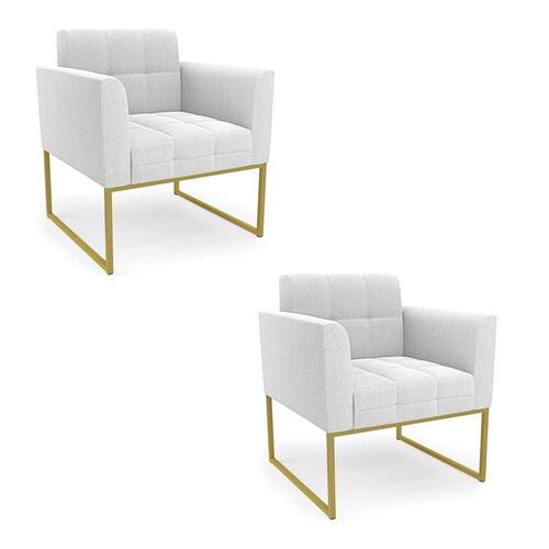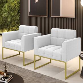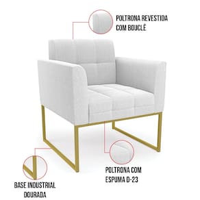 A Poltrona Elisa é uma poltrona que combina elegância, conforto e durabilidade. Ela tem um design retrô e sofisticado, com Base Industrial Dourado e revestimento em tecido Bouclê Off White, que harmonizam com qualquer ambiente. Ela é ideal para sala de estar, recepções, escritórios, cozinhas ou qualquer outro espaço que você queira decorar com estilo e bom gosto. Ela tem uma estrutura em madeira de reflorestamento eucalipto, que garante a resistência e a sustentabilidade do produto. Ela suporta até 120 kg de peso, podendo ser utilizada por pessoas de diferentes biotipos. Ela tem um acabamento reforçado e espuma de qualidade D23, que oferece maciez e aconchego. Ela contém detalhes de costura no encosto e assento, resultando em um acabamento impecável, conferindo muito mais valor e elegância ao produto. A Poltrona Elisa é um móvel de alta qualidade, beleza e funcionalidade. Ela é fácil de transportar, pois tem um peso leve e um tamanho compacto. A Poltrona Elisa é um produto que vai fazer a diferença na sua decoração e no seu bem-estar. Ela vai trazer charme, conforto e durabilidade para o seu ambiente. Aproveite essa oferta e leve para casa uma poltrona de qualidade por um preço incrível. Essa é a sua chance de ter uma poltrona maravilhosa por um preço imperdível. Corra e garanta seu Kit 2 Poltronas antes que acabe o estoque!