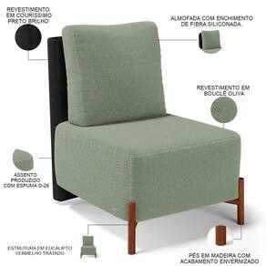 Imagine-se desfrutar de máximo conforto e aconchego, imersos na nossa nova Poltrona Hungria, que é a personificação da inovação! Seus pés em madeira garantem estabilização, além de dar o toque rústico que fica um show no ambiente! Seu estofamento, e almofadas foram cuidadosamente selecionados para trazerem elegância e comodidade. Pode ser disposta em vários ambientes como livings, sala de estar, halls de entrada e quartos, traz sua essência ao cômodo, oferecendo uma sensação de bem estar para todas as horas. Permita-se recarregar as energias com graciosidade, adquira já a sua! Dimensões do produto (L x A x P) 58 x 88 x 70 cm Medidas Internas: Altura do chão ao encosto: 76 cm Largura do assento: 56 cm Altura do assento: 30 cm Altura da almofada: 43 cm Profundidade do assento: 62 cm Altura do chão ao assento: 45 cm Espessura da almofada: 15 cm Largura da almofada: 45 cm Características: Estrutura em Madeira de Eucalipto Vermelho tratado. Revestimento do encosto em Couríssimo na cor Preto e do assento em Bouclê na cor Oliva, de alta qualidade. Almofada Solta, com enchimento de fibra siliconada. Assento com espuma D-26. Suporta até 120 kg. Pés em Madeira com Acabamento Envernizado. - Por se tratar de estofado as medidas podem ter uma pequena variação de até 3 cm. - A tonalidade do produto real poderá ter ligeira variação devido o lote de tecidos. Observações importantes: - Produto para uso residencial em ambiente interno, não devendo ficar exposto diretamente ao sol, calor e umidade excessivos. - Pode haver alguma diferença de tonalidade entre a imagem e o produto real, por conta do tratamento de imagens e a calibração de cores do seu monitor. - As imagens são meramente ilustrativas, não acompanham objetos de decoração e eletrônicos. - Ao receber a mercadoria, o cliente deve verificar as condições da embalagem, caso haja alguma não assine o de . - Montagem, desmontagem e outras instalações serão de responsabilidade do cliente. Não nos responsabilizamos, no ato da , por subir escadas/elevadores ou pelo por guincho em apartamentos. Eventuais despesas são de responsabilidade do comprador.- Confira as dimensões do produto e certifique-se de que passará normalmente por supostos elevadores, portas, escadas e/ou corredores de sua residência Color: Verde Orquídea | ColorFamily: Verde Claro | ColorSimple: Verde Orquídea | ColorSupplier: Verde Orquídea | Material: Madeira e Espuma | MaterialFamily: Madeira | Model: Hungria | OriginCountry: | OriginState: PR | ProductContents: 01 Poltrona | ProductHeight: 88 cm | ProductInstructions: Produto para uso em ambiente interno, nao devendo ficar exposto ao sol, calor e umidade excessivos. | ProductLength: 70 cm | ProductWarranty: 90 dias após o do produto | ProductWeight: 12 kg | ProductWidth: 58 cm | SizeDescription: Altura: 88 cm Largura: 58 cm Profundidade: 70 cm | SupplierSimpleName: Poltrona Decorativa Sala Estar Living Pés Madeira Hungria L02 Couríssimo Preto Bouclê Oliva - Lyam