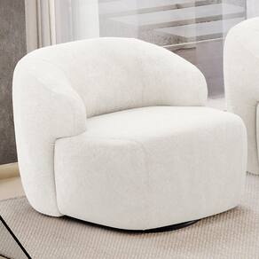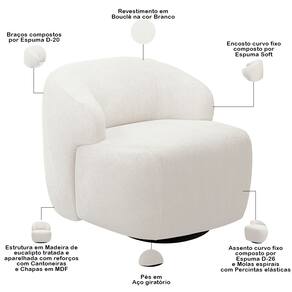 Características: Estrutura em madeira de eucalipto tratada e aparelhada com reforços, cantoneiras e chapas em MDF. Revestimento em Bouclê de alta qualidade na cor Branco. Encosto curvo fixo composto por espuma soft. Assento curvo fixo composto por espuma D-26 e molas espirais. Percintas elásticas no assento para maior resistência e durabilidade. Braços compostos por espuma D-20. Pés em aço giratório. Peso suportado: Até 120 kg.