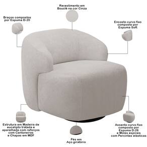 Características: Estrutura em madeira de eucalipto tratada e aparelhada com reforços, cantoneiras e chapas em MDF. Revestimento em Bouclê de alta qualidade na cor Cinza. Encosto curvo fixo composto por espuma soft. Assento curvo fixo composto por espuma D-26 e molas espirais. Percintas elásticas no assento para maior resistência e durabilidade. Braços compostos por espuma D-20. Pés em aço giratório. Peso suportado: Até 120 kg.
