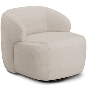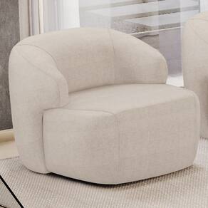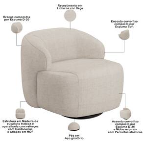 Características: Estrutura em madeira de eucalipto tratada e aparelhada com reforços, cantoneiras e chapas em MDF. Revestimento em Linho de alta qualidade na cor Bege. Encosto curvo fixo composto por espuma soft. Assento curvo fixo composto por espuma D-26 e molas espirais. Percintas elásticas no assento para maior resistência e durabilidade. Braços compostos por espuma D-20. Pés em aço giratório. Peso suportado: Até 120 kg.