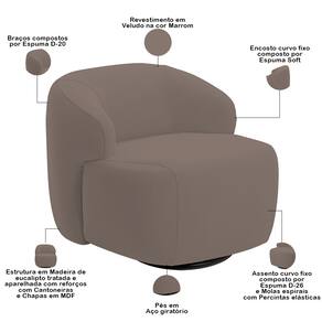 Características: Estrutura em madeira de eucalipto tratada e aparelhada com reforços, cantoneiras e chapas em MDF. Revestimento em Veludo de alta qualidade na cor Marrom. Encosto curvo fixo composto por espuma soft. Assento curvo fixo composto por espuma D-26 e molas espirais. Percintas elásticas no assento para maior resistência e durabilidade. Braços compostos por espuma D-20. Pés em aço giratório. Peso suportado: Até 120 kg.
