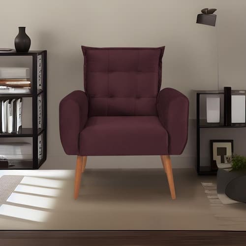 Produto: Poltrona Dakota | Conteúdo da Embalagem: Poltrona Dakota | Nome do Simples no Fornecedor: Poltrona Decorativa para Sala de Estar Quarto e Escritorio Dakota Veludo Chumbo | Altura do Produto (cm): 100 | Largura do Produto (cm): 83 | Comprimento do Produto (cm): 75 | Altura do Produto com embalagem (cm): 80 | Largura do Produto com embalagem (cm): 88 | Comprimento do Produto com embalagem (cm): 77 | Descrição do Tamanho: 100 X 83 X 75 cm | Peso do Produto com embalagem (Kg): 26 | Peso do Produto (Kg): 25 | Material da Estrutura: Madeira Maciça | Material para Filtro: Madeira | Instruções/Cuidados: Não deixe o móvel exposto ao sol. Evite contato com líquidos. | Estado de Origem: PR | Garantia do Fabricante: 3 meses contra defeitos de fabricação. Não cobrimos alterações e/ou montagem errada. | Garantia em Meses: 3 | Fabricado Por: Matrix | Vendido Por: Zanin Shop | Cômodo Indicado: Sala de Estar | Possui Pés: Sim | Volumes: 1 | Medidas do Encosto: 55 X 55 X 20 cm | Medida do Assento: 47 X 52 X 50 cm | Medidas Braças: 35 X 15 X 70 cm | Peso Suportado: 100 Kg | Revestimento: Tecido Veludo | Material dos Pés: Madeira Maciça | Material do Enchimento: Espuma | Tipo de produto: Poltrona | Largura Produto Com Embalagem (cm): 88 Cor: Vinho