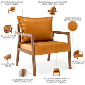 A Poltrona Decorativa Para Sala de Estar e Living Alícia B04 Couríssimo Whisky é a peça perfeita para adicionar um toque de estilo moderno a sua sala de estar. Com sua estrutura em madeira maciça envernizada, essa poltrona de madeira traz durabilidade e elegância para o ambiente. O assento estofado e revestido com materiais de qualidade oferece conforto excepcional, permitindo que você relaxe com estilo. Já o design moderno combina perfeitamente com qualquer tipo de decoração, tornando-a uma escolha versátil para qualquer sala de estar, living, recepção, escritório e diversos outros ambientes. A cereja do bolo fica por conta do detalhe da corda trançada no encosto com a almofada sobreposta, um charme à parte.