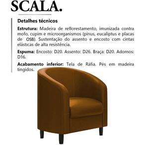 Poltrona Decorativa Pes Em Madeira Scala Corano, ideal para deixar seu ambiente com um design moderno e versátil, sem abrir mão da qualidade e conforto. Estrutura em madeira de reflorestamento (pinus, eucaliptos e placas de OSB) e cintas elásticas de alta resistência. Composta por madeira imunizada contra mofo, cupim e microrganismos, revestimento em tecido corano, encosto em espuma D-20, assento em espuma D-26, braça em espuma D-20, adornos em espuma D-16, acabamento inferior em tela de ráfia, e 4 pés em madeira tingidos. É perfeita para acomodar visitas e convidados, ideal para ser utilizada em salas, hall de entrada e escritórios. Este móvel chegará na sua casa separado em 01 volume.