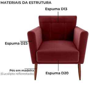 Madeira de Eucalipto, Espuma, Tecido VeludoPoltrona Cancun, estilo retrô e toque de sofisticação para seu ambiente. Estrutura em Madeira de Eucalipto (reflorestamento) reforçada com percintas elásticas, estofada com espumas D20 (assento), D23 (braças) e D13 (encosto). Revestida em tecido Veludo (toque suave e acabamento sofisticado), com detalhes em costura quadriculada no encosto, possui 4 pés palito também em madeira. Este produto será entregue em 01 volume.