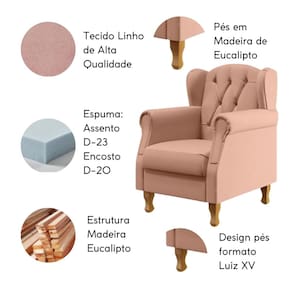 Poltrona Decorativa Tainá - Estilo, Conforto e Sofistição para sua Sala de Estar! Transforme sua sala com a Poltrona Decorativa Tainá, o móvel ideal para quem busca poltrona reforçada, elegante e moderna. Com design sofisticado, pés em estilo Luis XV e acabamento em linho rosê, ela é perfeita para dar aquele toque de charme e personalidade à sua recepção, escritório, quarto ou home office.